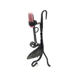 Der Kerzenständer ist vollständig von Hand aus Eisen geschmiedet. Die organisch geschwungene Form, die gedrehte Stange sowie die frei ausgeformte Tropfschale zeugen von hoher handwerklicher Fertigkeit und einem sicheren Gespür für Proportion und Bewegung. Sichtbare Hammerschläge und die dunkle Schmiedeoberfläche unterstreichen den ursprünglichen, ehrlichen Charakter des Stücks.