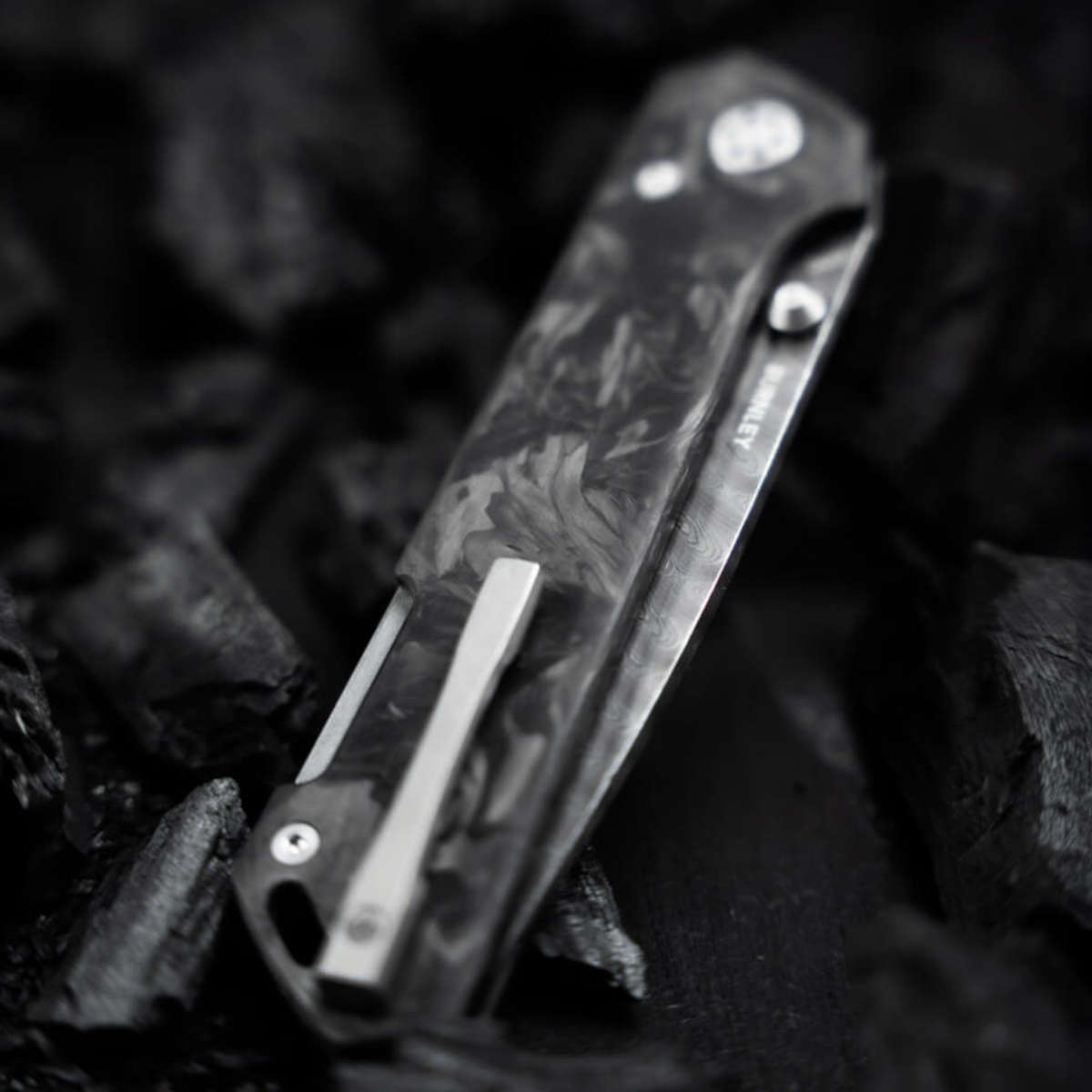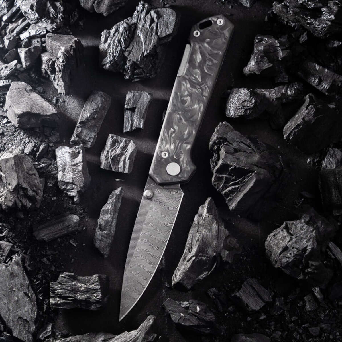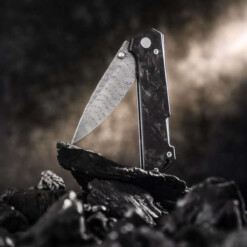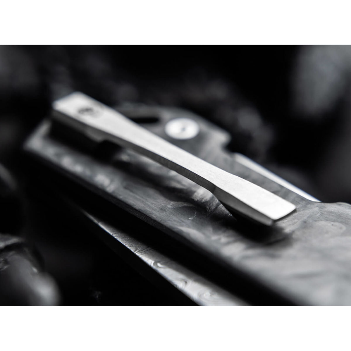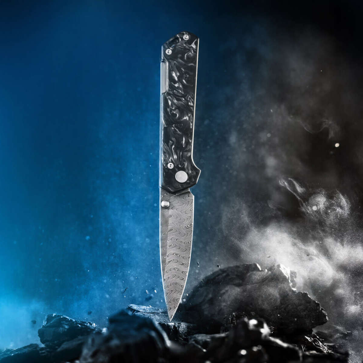 Herzstück ist die 160-lagige Damastklinge im klassischen Ladder-Muster. Mit 58 HRC (±1) bietet sie eine sehr gute Kombination aus Schnitthaltigkeit, Alltagstauglichkeit und einer lebendigen, charakterstarken Optik. Das Messer öffnet sich bequem per Daumenpin und verriegelt zuverlässig via Back-Lock – sicher, intuitiv und bewährt.