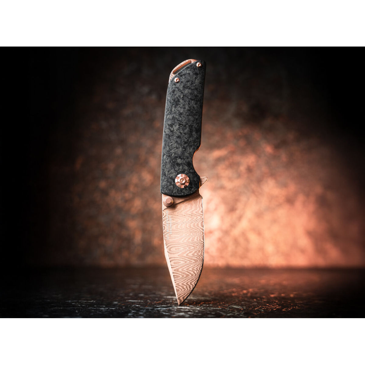 Zusätzlich verfügt dieses Sondermodell über eine Roségold-Beschichtung auf der Klinge, dem Clip und den Schrauben, was dem Messer ein besonders elegantes Finish verleiht. Das Einhand-Taschenmesser lässt sich wahlweise per Flipper oder Daumenpin mühelos öffnen und wird mit einem stabilen Frame Lock gesichert. Der Hinderer Lock-Stop schützt vor Überdehnung des Verschlusses und sorgt für zusätzliche Haltbarkeit.