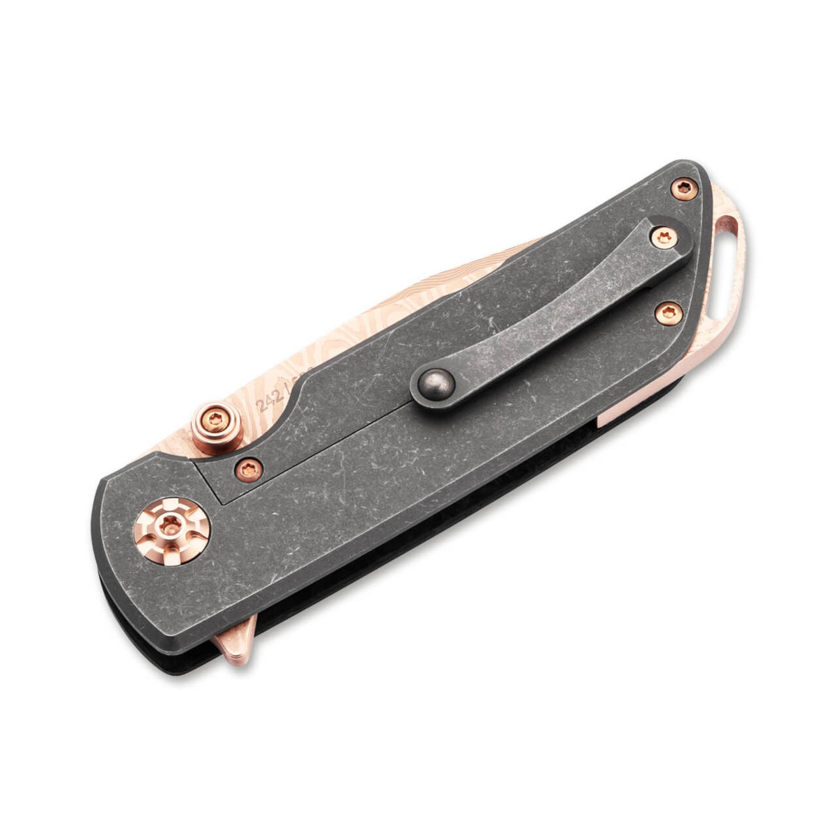 - Roségold-Beschichtung – Verleiht der Klinge, dem Clip und den Schrauben ein edles Finish