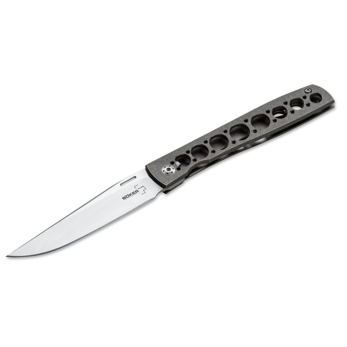 Basierend auf dem Grundmodell des Urban Trapper, bietet das Modell Böker Plus Urban Trapper 42 die gleiche hochwertige Ausstattung, ist jedoch anstelle des Flippers mit einem Nagelhau zur Zweihandbedienung ausgestattet. Bei gerade einmal 8 mm Griffdicke (gemessen ohne Clip) ist das Urban Trapper für seine normale Gebrauchsgröße mit dem Begriff “schlank” nur unzulänglich charakterisiert. Durch die großen Bohrungen und das verwendete Titan ist das Urban Trapper 42 mit gerade einmal 48 Gramm ein echtes Leichtgewicht, das auch in einer Anzughose oder in einer leichten Sommerhose extrem komfortabel zu tragen ist.