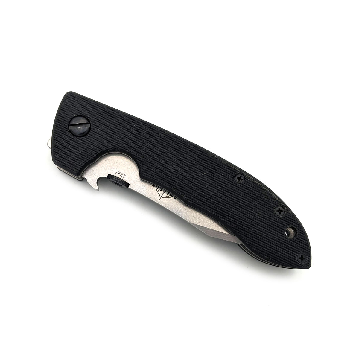 Das Emerson Mini CQC-8 Horseman überzeugt durch seine hervorragende Ergonomie: Der Griff mit großer Fingermulde und passender Dicke liegt perfekt in der Hand. Die Klinge lässt sich wahlweise per Daumenpin oder Emerson Wave Schnellöffnungssystem öffnen – Letztere ermöglicht das schnelle Ziehen direkt aus der Tasche und kann zudem als Flaschenöffner genutzt werden. Der rutschfeste G10-Griff sorgt für sicheren Halt, während die Titan-Liner das Messer angenehm leicht machen. Die einseitig geschliffene Clippoint-Klinge aus 154CM-Stahl ist bereits sehr scharf, mit einem robusten Stonewashed-Finish versehen und verfügt über eine praktische Teilsägezahnung. Ein Liner-Lock hält die Klinge zuverlässig im Einsatz.