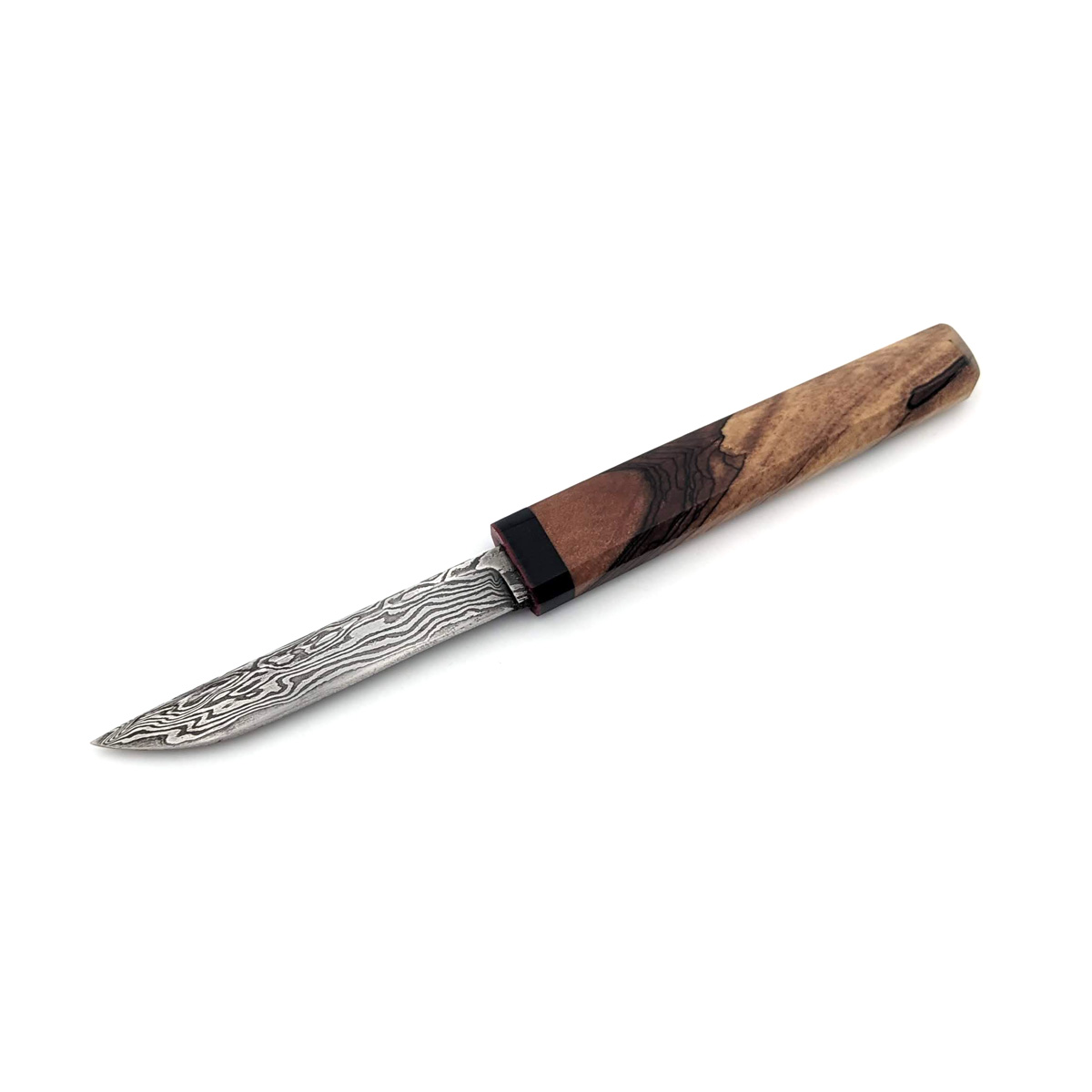 Dieses handgefertigte Neckknife stammt aus der Werkstatt des österreichischen Messermachers Florian Pletschacher und ist ein echtes Einzelstück. Die Klinge aus kunstvollem Damaststahl, geschmiedet aus C100 und 15N20, besticht durch ihre faszinierende Maserung, Schärfe und Widerstandsfähigkeit. Vollendet wird das Messer durch einen Griff aus stabilisiertem, gestocktem Apfelholz – jedes Stück ein Unikat der Natur, das in Farbe und Struktur einzigartig bleibt.