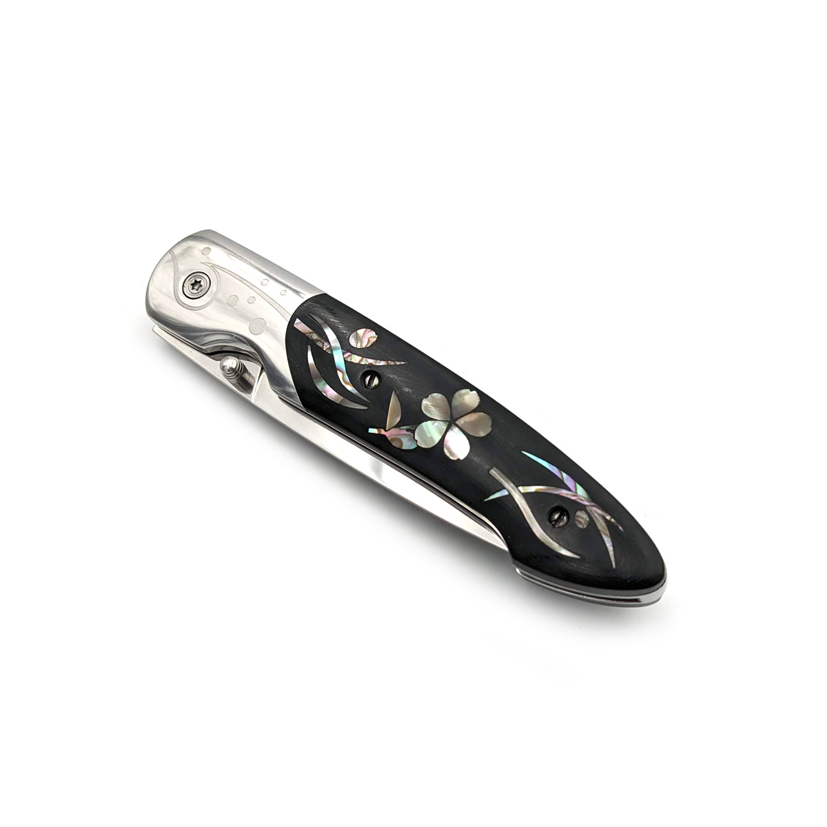 Das Herbertz Einhandmesser Micarta kombiniert markante Optik mit solider Funktionalität. Die Griffschalen aus schwarzem Micarta werden von polierten Edelstahlbeschlägen eingerahmt, wodurch ein harmonischer Kontrast entsteht. Besonders auffällig ist die aufwendig gestaltete vordere Griffseite, die mit floralen Abalone-Einlagen verziert ist und dem Messer eine edle, beinahe schmuckartige Note verleiht.