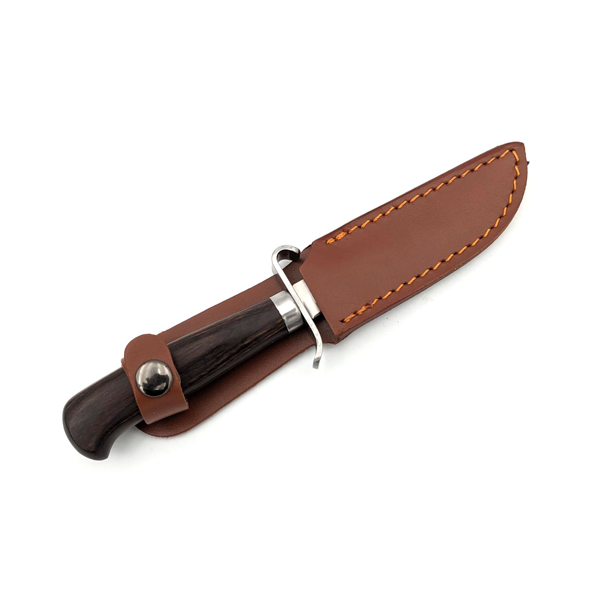 Der ergonomisch geformte Griff aus Pakkaholz ist auf kleinere Hände abgestimmt und lässt sich angenehm führen. Für den Transport unterwegs liegt eine stabile Lederscheide bei, die das Messer sicher am Gürtel fixiert.