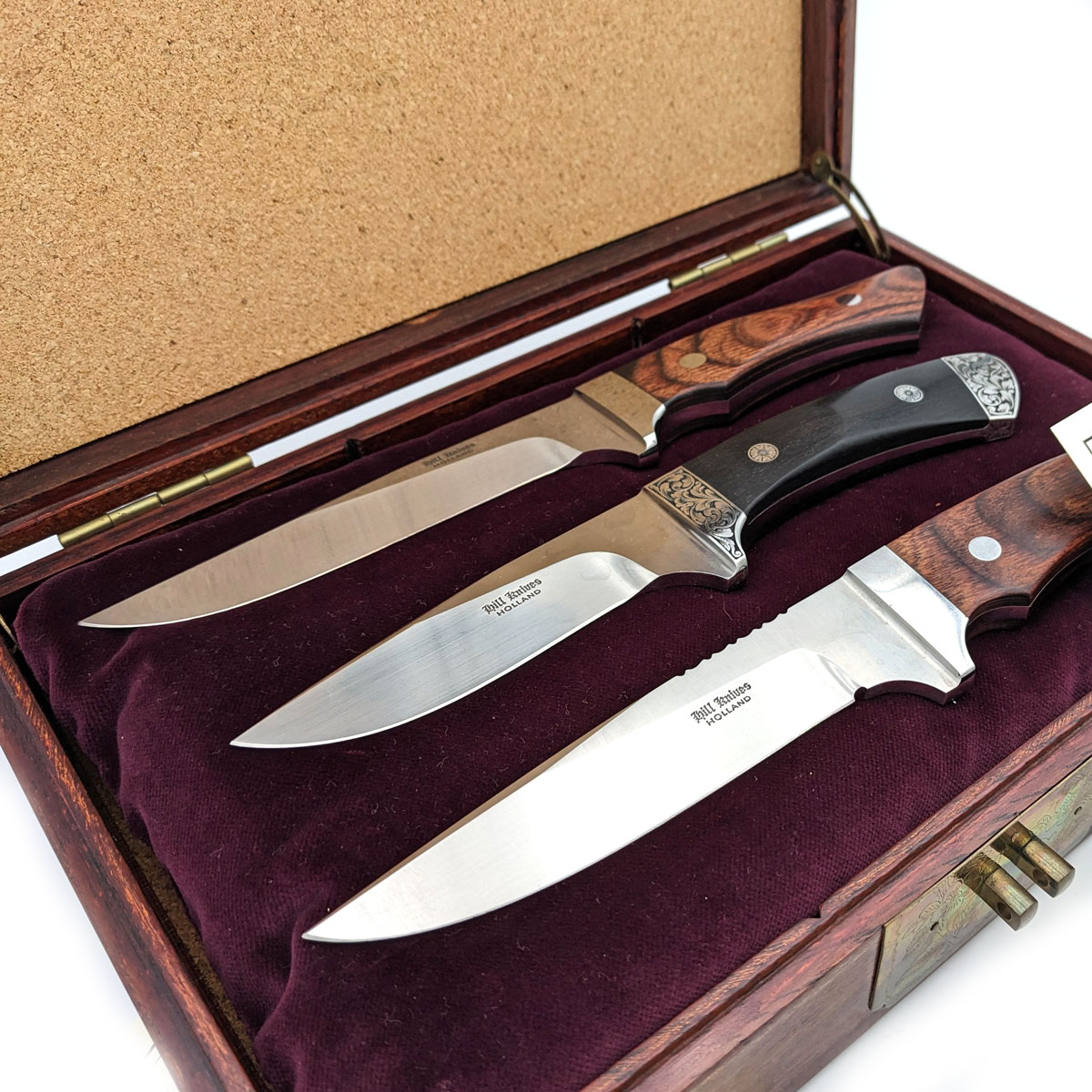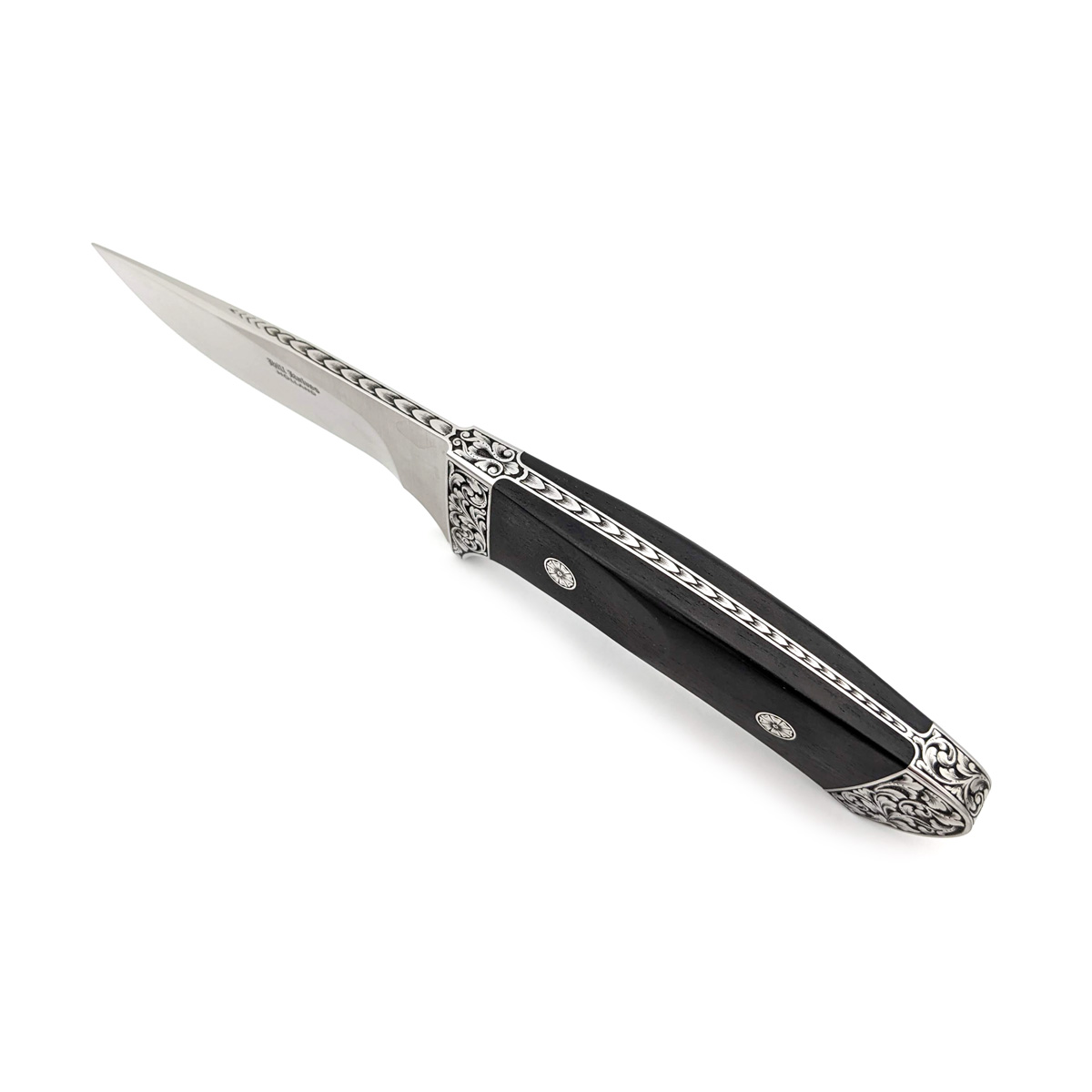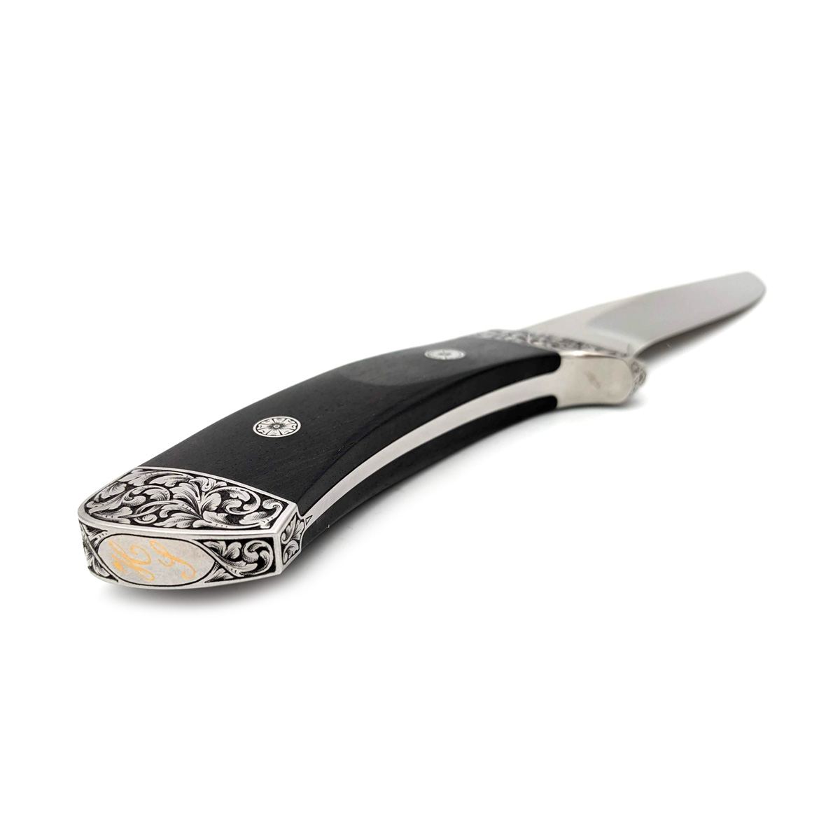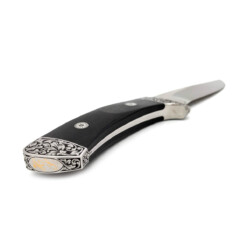 Das Hill Knives Modell 82 ist ein besonderes Sammlerstück mit handgemachter Gravur, die sich von der ATS34-Klinge über den Messerrücken bis zum Knauf zieht. Der Knauf trägt eine goldfarbene Verzierung. Der Griff besteht aus edlem Ebenholz. Ein außergewöhnliches Stück für Sammler und Liebhaber hochwertiger Handwerkskunst.