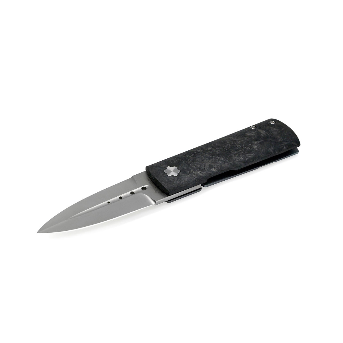 Herzstück des Maserin Daga ist die namensgebende Dolchklinge, die aus Elmax gefertigt wurde und einseitig geschliffen ist. Dekorative Durchbrüche in der Hohlkehle verleihen dem Taschenmesser eine moderne Note, die durch den Fatcarbon Griff untermalt wird. Geöffnet wird das Daga per Flipper, während der Titan Frame Lock die Verriegelung übernimmt. Ein echter Hingucker ist die Blütenförmige Klingenachsschraube.