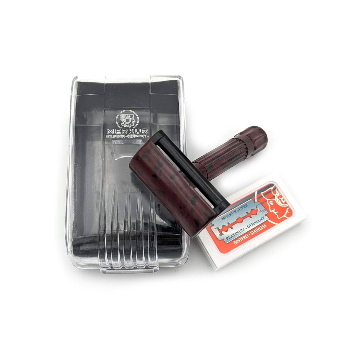 Der MERKUR Rasierhobel Bakelit überzeugt mit einem leichten Retro-Design im Stil der 1960er Jahre. Bakelit, einer der ersten Kunststoffe des 20. Jahrhunderts, zeichnet sich durch hohe Widerstandsfähigkeit gegenüber mechanischer Belastung, Hitze und Säuren aus. Der Rasierer verfügt über einen leichten, verschraubbaren Rasierkopf und liegt angenehm in der Hand. Zum Lieferumfang gehören ein Kunststoff-Reiseetui sowie zehn Ersatzklingen. Mit einer Gesamtlänge von ca. 8,3 cm eignet sich der Rasierer ideal für den mobilen Einsatz. Gefertigt in Solingen, Deutschland, steht er für klassische Handwerksqualität und zeitloses Design.