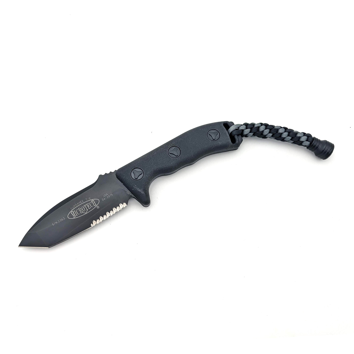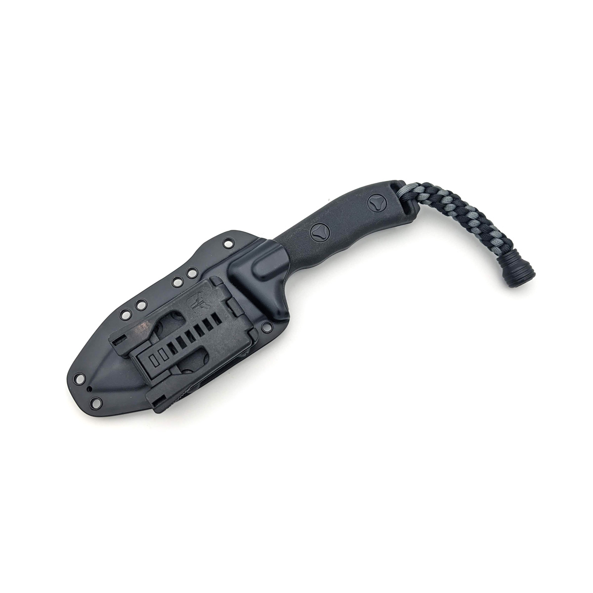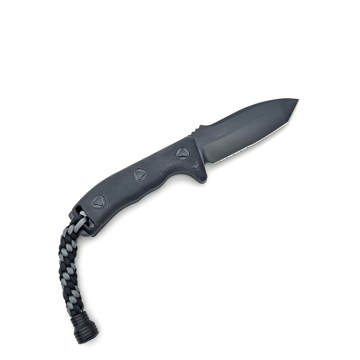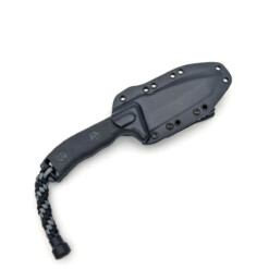 Das Currahee überzeugt durch seine robuste Bauweise. Die Tanto-Klinge aus D2-Stahl ist vollangelötet, vollständig mit einem Wellenschliff versehen und in einem schwarzen Finish gehalten. Der Griff aus Polymer verfügt über eine Öse für ein Lanyard sowie eine Knocker-Bead. Zum Lieferumfang gehört eine strapazierfähige Scheide mit MOLLE-Befestigung.