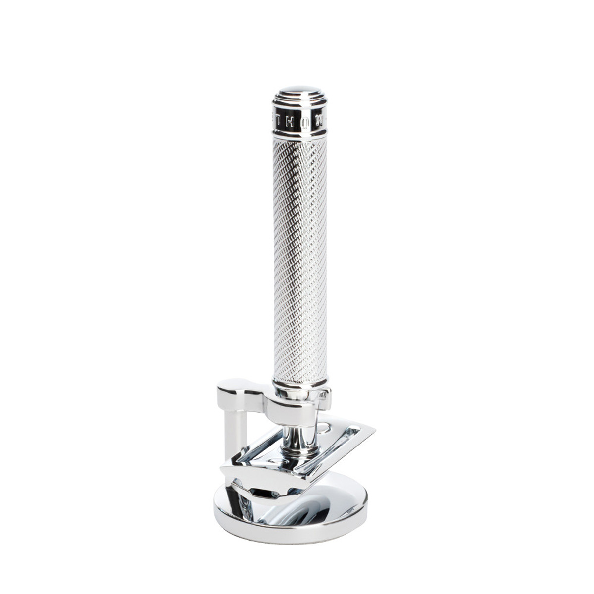 Der elegante Mühle Halter aus massivem Metall ist hochglanzverchromt und passend für alle Rasierhobel der MÜHLE-Serien TRADITIONAL, KOSMO und STYLO. Seine robuste Verarbeitung und der kostbare Glanz des Chroms vereinen Funktionalität mit zeitloser Ästhetik. Der Halter bewahrt das Rasur-Accessoire sicher auf und sorgt für Ordnung im Badezimmer.