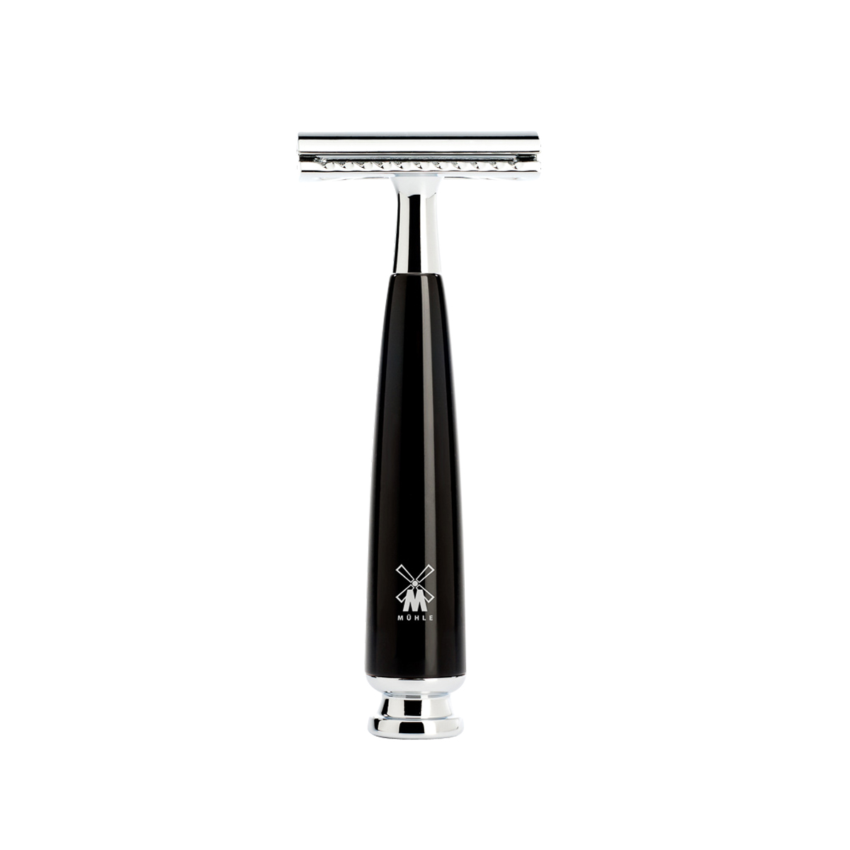 Der Mühle RYTMO Rasierhobel besitzt einen klassischen geschlossenen Kamm und hat einen Griff aus schwarzem Edelharz.