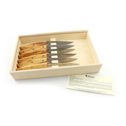 Das handgefertigte Saladini Steakmesser-Set aus der Toskana steht für eine besonders gelungene Verbindung aus moderner Formensprache und präziser Schneidtechnik. Die fein ausgeschliffene, äußerst scharfe Klinge ist hervorragend ausbalanciert und sorgt zusammen mit der angenehmen Handlage für ein müheloses Schneideerlebnis. Die Griffschalen bestehen aus handverlesenem Olivenholz, dessen charakteristische Maserung jedem Messer eine warme, individuelle Ausstrahlung verleiht.