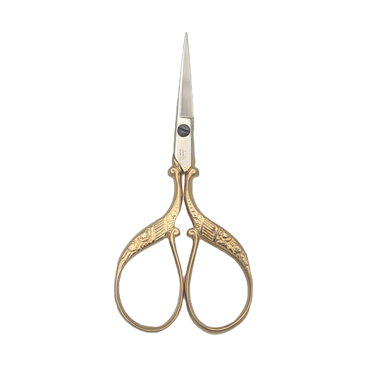 Die dekorativ geschwungenen Augen und Halme bilden eine Einheit im Griffdesign und prägen die optische Gestaltung der Schere. Die vergoldete Oberfläche verleiht dem Gesamtbild zusätzlich eine hochwertige Anmutung.