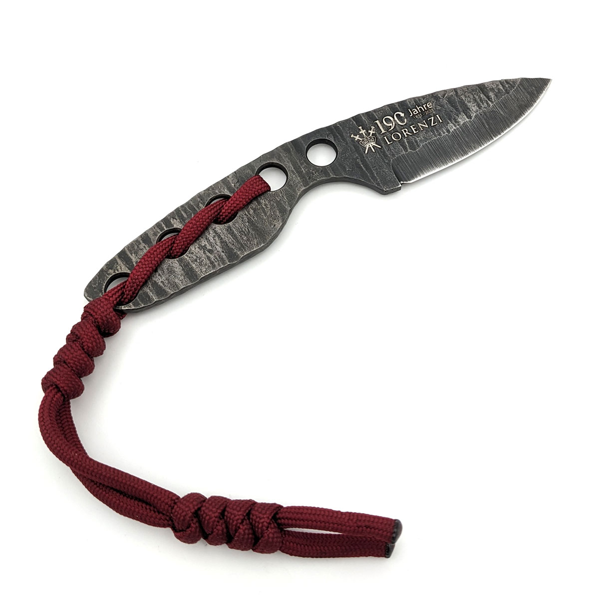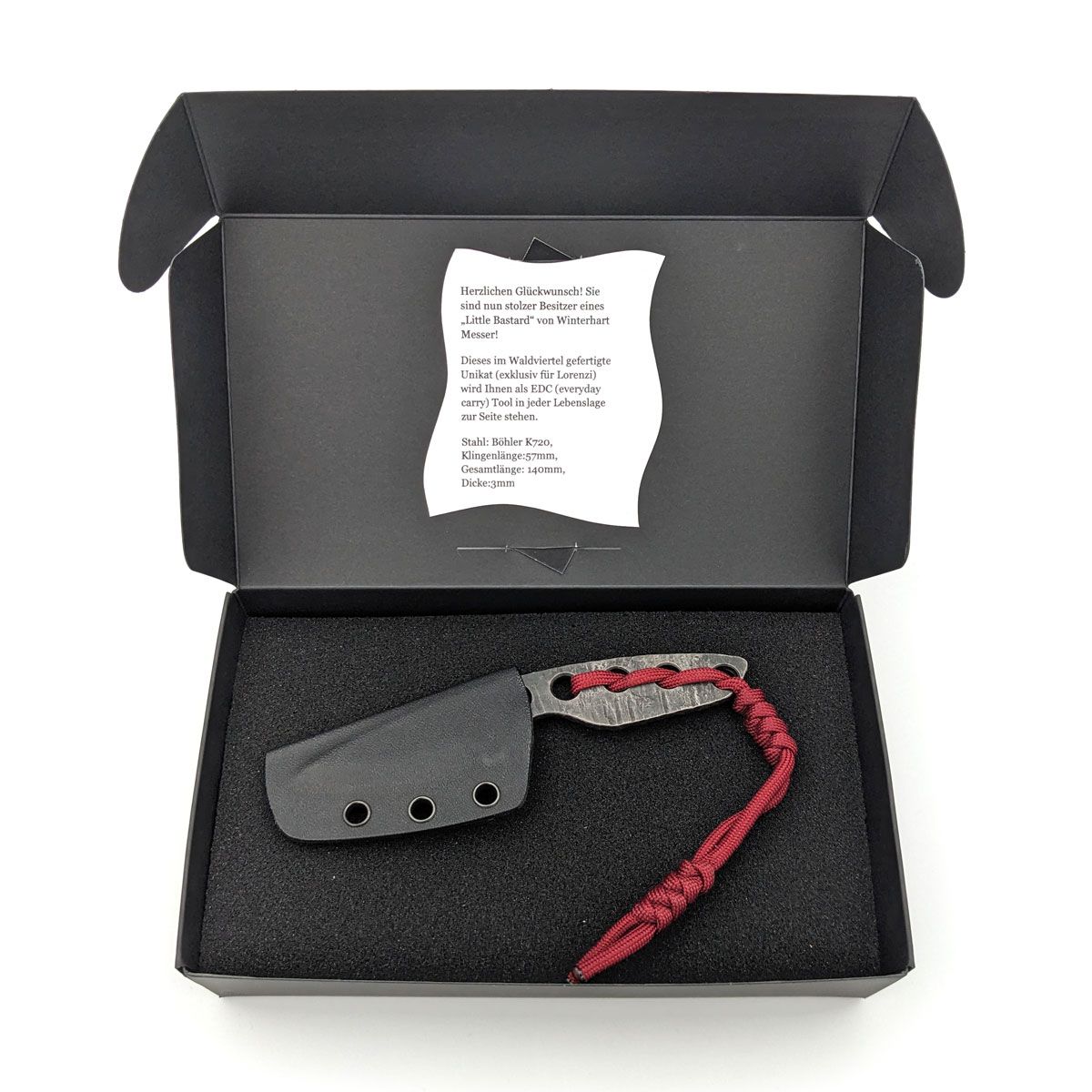 Das Little Bastard ist ein kleines EDC-Fixed vom jungen niederösterreichischen Messermacher Paul Winter. Wir haben uns im Mai 2025 auf der Knifeshow Austria kennen gelernt und eigentlich gleich vom Stand weg ein kleines Jubiläumsprojekt geplant: Anstatt seines klassisch schwarzen Paracords kommt bei unserer Jubiläumsversion eines in sattem Bordeaux-Rot zum Einsatz.